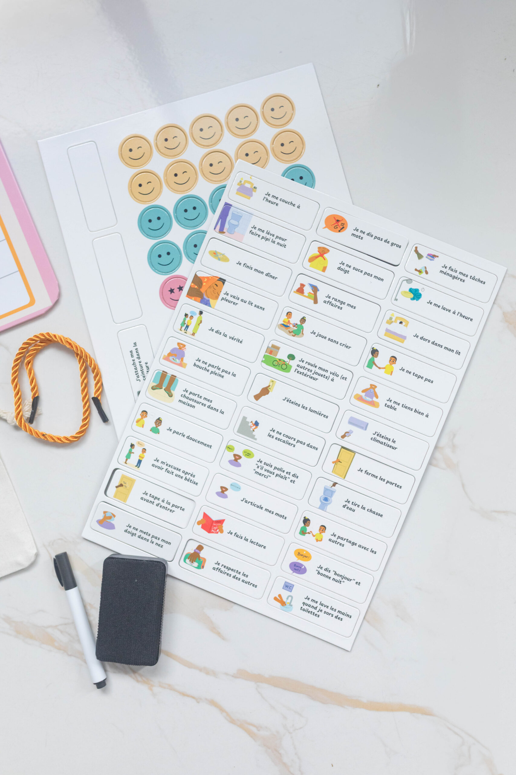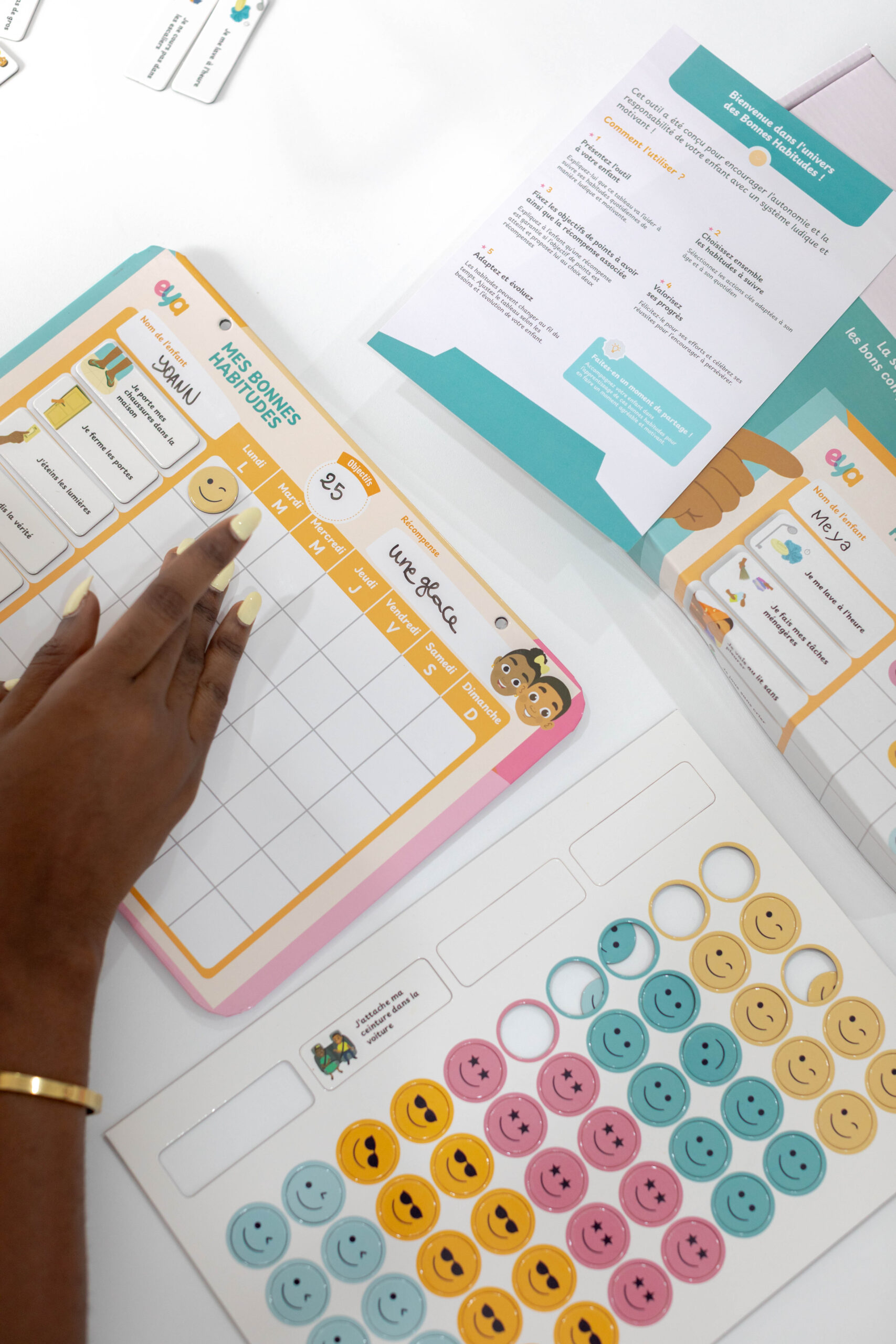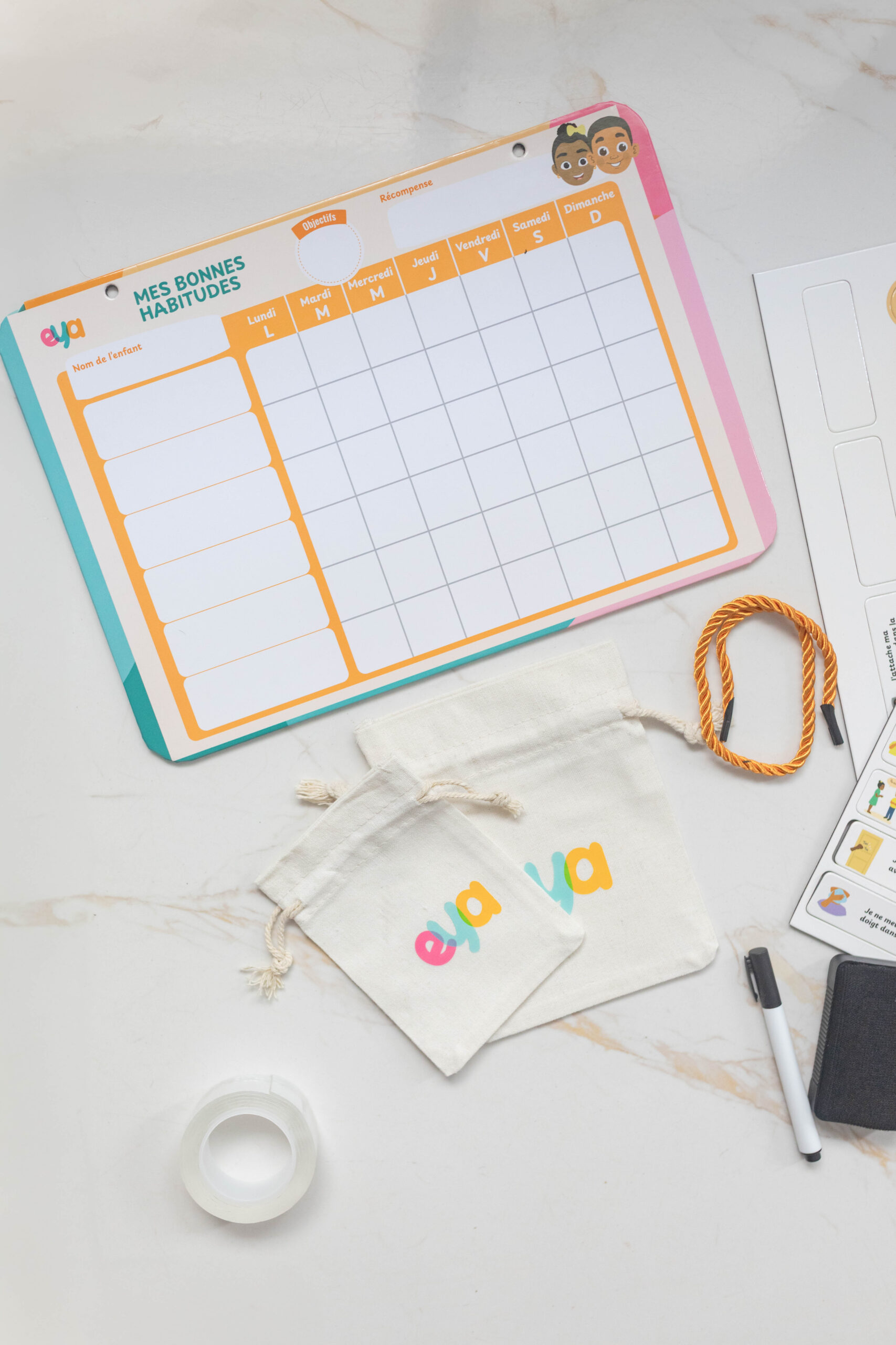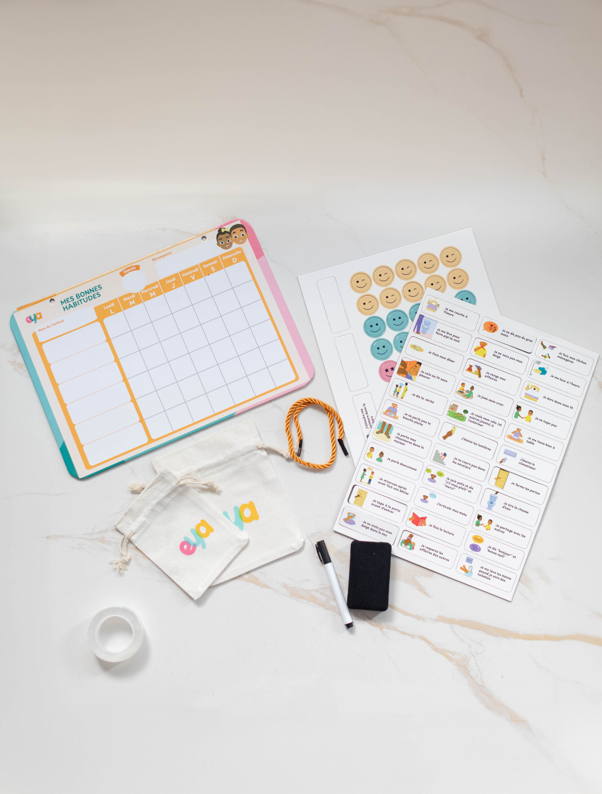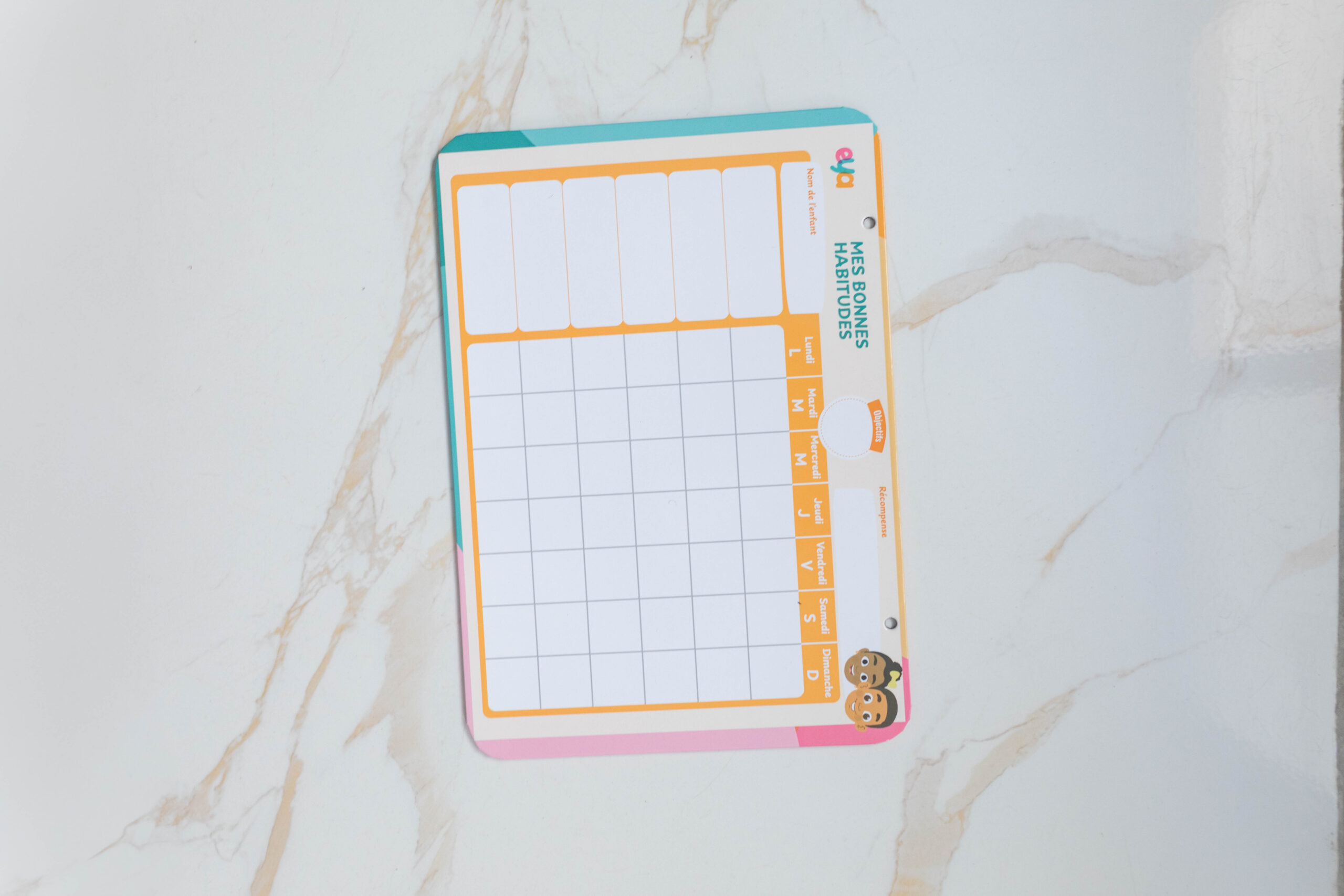 Simple, ludique et motivant, le tableau permet à votre enfant de suivre ses progrès et d’être fier de lui à chaque bonne habitude réalisée.