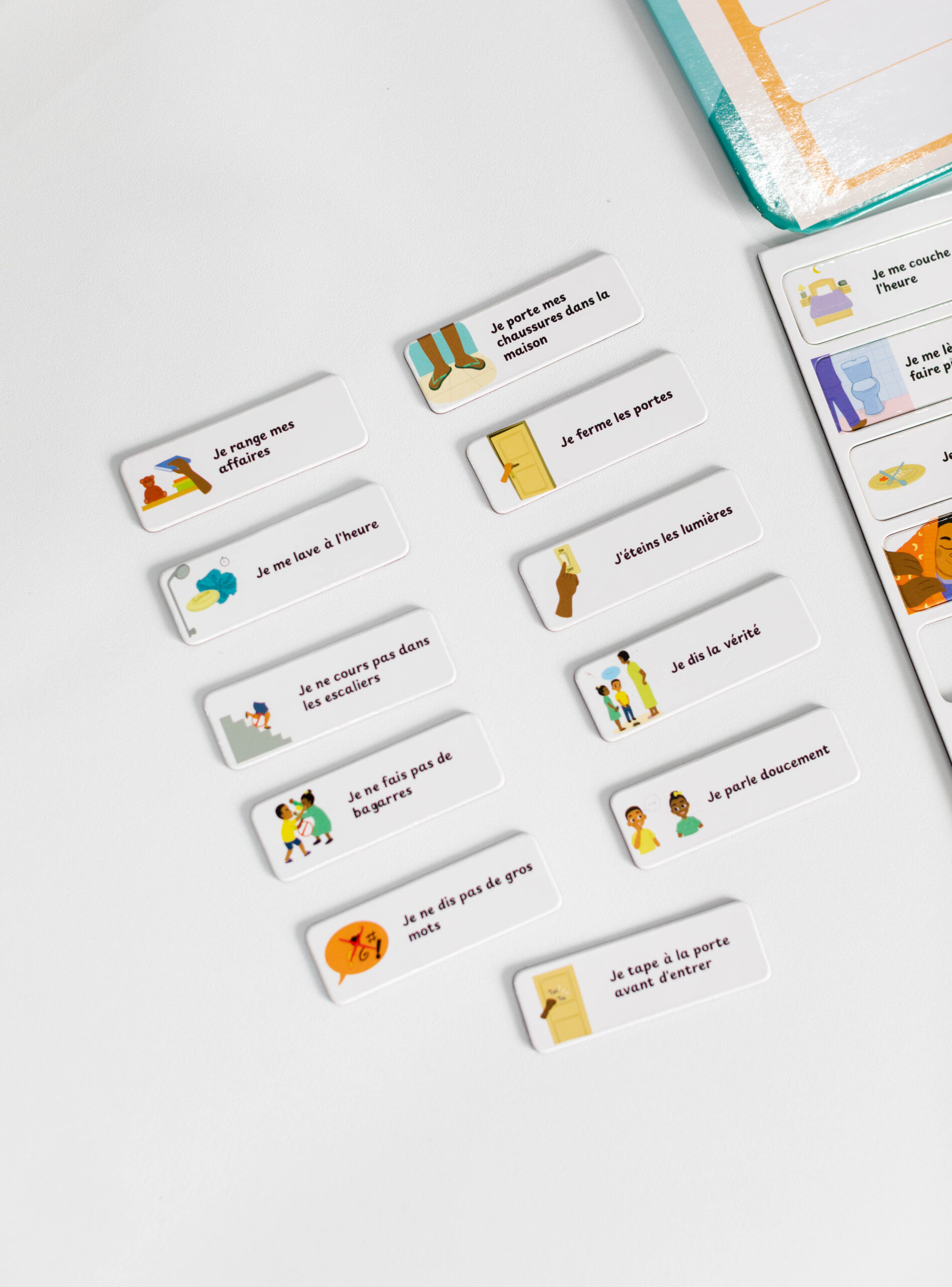 Ce tableau a été conçu pour aider votre enfant à adopter et à maintenir de bonnes habitudes au quotidien — qu’il s’agisse d’hygiène, de politesse ou de petites responsabilités à la maison. Grâce à des magnets illustrés et colorés, il visualise chaque geste positif à accomplir dans la journée.